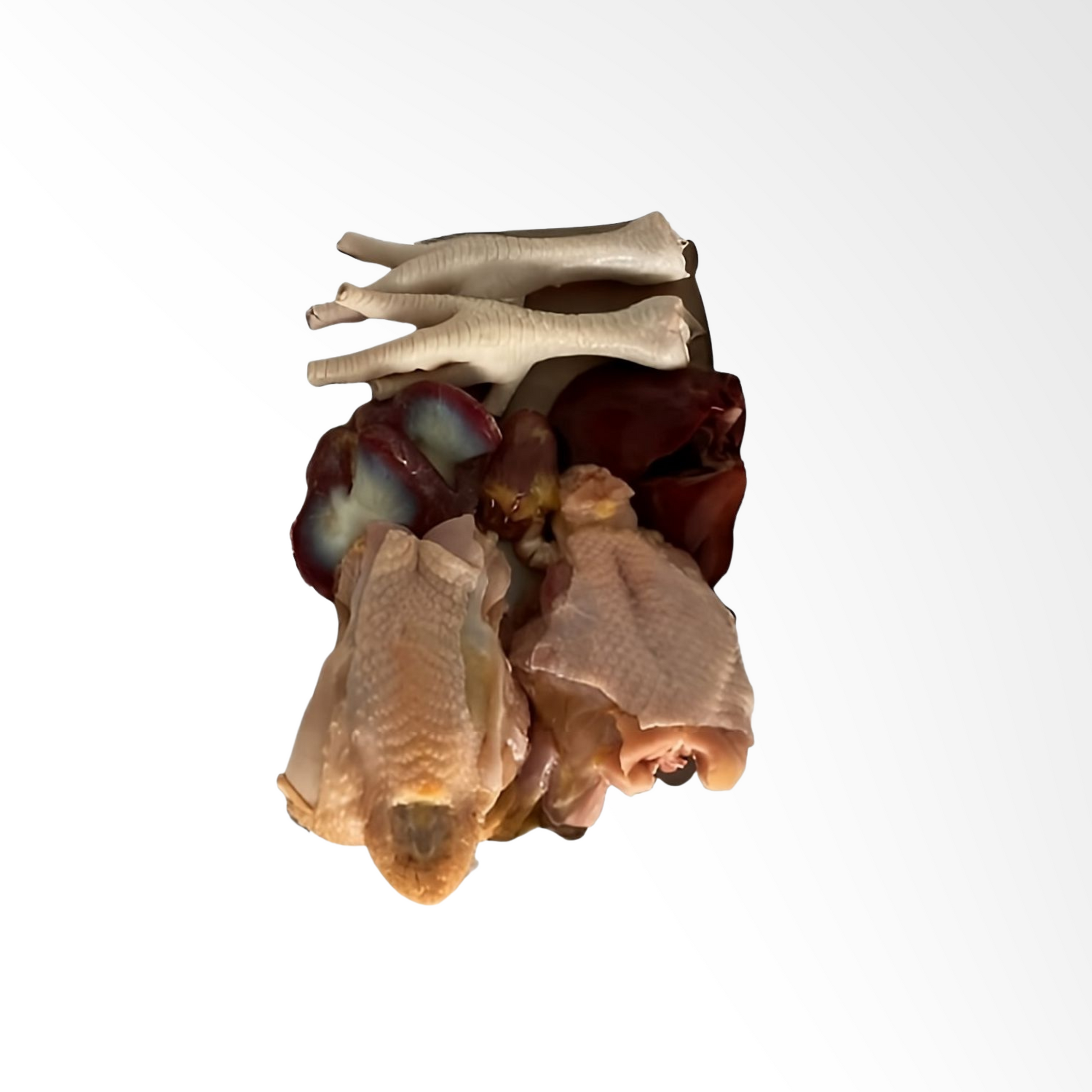 Nuestra base para caldo incluye huacal, rabadilla, patas, hígado, molleja y corazón de pollo 100% orgánico. Todo lo que necesitas para preparar un caldo verdaderamente nutritivo, lleno de sabor, colágeno natural y ese toque que solo dan los ingredientes reales, sin procesar y sin químicos.